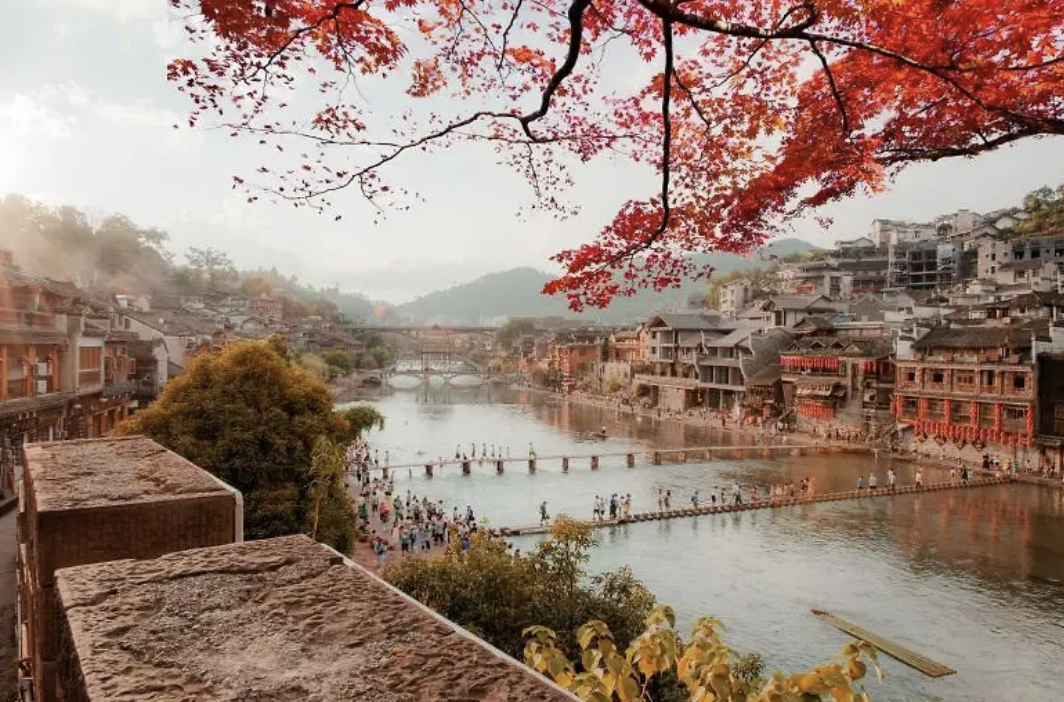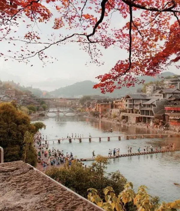 Dạo bước tại Phượng Hoàng Cổ Trấn – phố cổ gỗ bên dòng sông Đà Giang, nền trời vàng mùa thu lung linh.